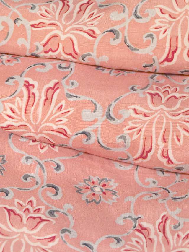 沈んだ虹色の地に唐花草でかたどられた襷(たすき)の文様が染められている、羽二重の道中着です。袷仕立てです。 昭和初期ごろにつくられたと思われるアンティークのお品です。華やかでオリエンタルな趣のある意匠です。 アンティークなりのうっすらとしたくすみが全体的にあるほか、後衿から左右にかけて広くうっすらとした黄変があるほか、全体のところどころにもこまかなうすよごれや黄変がちらほらとあります。そのほかに目につく大きなしみやよごれ、褪色などのダメージはありませんが、状態ランク=「D」のご着用対象外、リメイク素材用とさせていただきます。 |