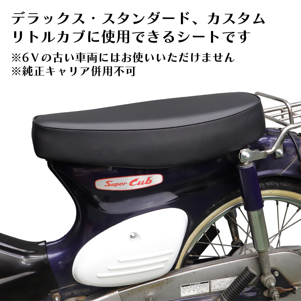 | スーパーカブ50 / 110(デラックス / スタンダード / カスタム) リトルカブ ※シートベース約53cm・ノーマル純正キャリア併用不可。 ※6Vの古い車両にはお使いいただけません。 *こちらのシートは出荷前に取り付け・外観を検品済です。 |