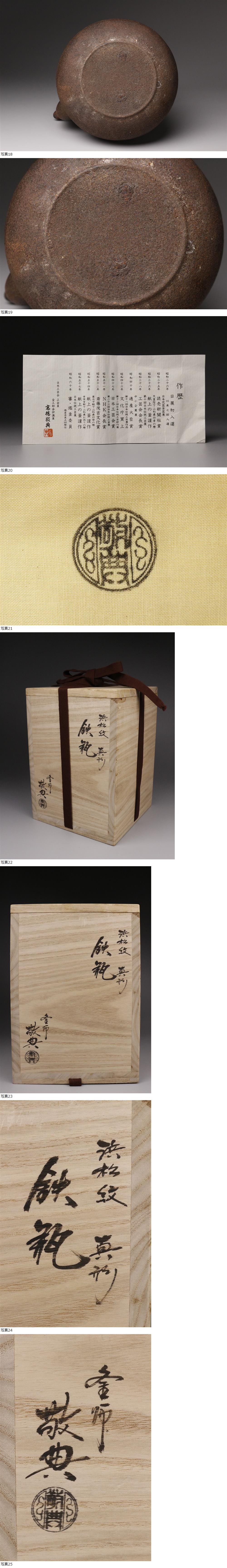 26012922* * * 商品詳細 * * * ここでしか出逢うことのできない唯一の美をご紹介させて頂きます。 山形鋳物の釜師として、重要無形文化財「茶の湯釜」保持者に認定された名工の 確かな技術力と高い芸術性を兼ね備えたお品でございます。 山形鋳物の伝統技術の結晶であり、鉄本来の重厚感と、繊細な浜松紋が見事に調和し、 趣のある虫喰摘蓋は、侘び寂びを感じさせる風情豊かな佇まいをしています。 共箱、共布、そして作家の作歴も揃っております。 卓越した技術と、伝統的な美意識に裏打ちされた質感と意匠を この機会にお手元にてご堪能下さい。 作家略歴 山形県山形市銅町出身。 茶の湯釜で重要無形文化財保持者(人間国宝)に認定される。本名は高橋高治 1938年:家業の「山正鋳造所」を継ぐ。 1950年:長野垤志に師事。 1951年:「和銑平丸釜地文水藻」で日展に初入選。 1961年:昭和天皇の山形県行幸で釜を献上。 1963年:「砂鉄松文撫肩釜」で日本伝統工芸展奨励賞受賞。 1972年:日本伝統工芸展鑑査委員となる。 1976年:「甑口釜」で日本伝統工芸展NHK会長賞受賞。 1979年:皇太子明仁親王(現在の明仁上皇)の山形県行啓で釜を献上。 1996年5月10日:重要無形文化財「茶の湯釜」保持者に認定される。 2009年6月23日:慢性腎不全により逝去。88歳没。 ■商品内容/鉄瓶、栞、共布、共箱 ■サイズ/横18cm×高22.5cm×奥行15㎝ 箱:横19cm×高26.5cm ■状態/スレ、傷、錆び、経年による傷み、シミ、栞に折れ 箱にスレ、傷、へこみ、シミがございます。 ※水漏れはございません。 ※写真にてご確認、ご了承の上ご入札下さい。 * * * 支払詳細 * * * !かんたん決済 * * * 発送詳細 * * * 入金確認後3営業日以内に発送致します。 ※直接引き取りも可能です。 60~160サイズにつきましては 佐川急便、ゆうパックのどちらかで発送いたします。 ゆうパック発送の場合、弊社の発送日から追跡サービスに問合せ番号が反映されるまで 約1日ほどお時間がかかりますのでご了承下さい。 * * * 注意事項 * * * 運送中の破損があった場合は速やかに当社までご連絡下さい。 保険を利用するのに受取連絡後に運送会社による現場での破損状況確認が必要となります。 勝手に返送されますと保険の適用外となりますのでご注意ください。 * * * * * * お問い合わせ:082-236-8669 |