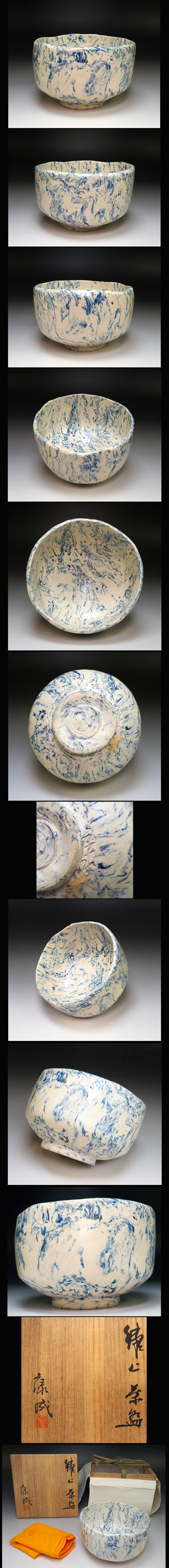 ![]() 練上手の人間国宝、松井康成のブルーの練上が綺麗な「練上茶碗」です。 作品に描銘サインがあります。 サイズ:約 径 13.2cm 高 8.3cm 共箱・共布付 作品状態:外傷キズはなく美品です。(目視確認です。) こちらの作品は真作保証の安心頂ける作品であることをお約束いたします。 不明な点は、入札前に質問等でご確認下さい。 松井康成 昭和2年(1927)~平成15年(2003) 重要無形文化財「練上手」保持者(平成5年認定) 長野県に生まれる。明治大学文学部を卒業後、笠間市の古刹月崇寺の住職を継ぎ、昭和35年境内に築窯し、広く中国古陶磁の技法を研究した後、練上に絞った作陶活動を展開させていった。練上は、色や濃淡の異なる土を組み合わせていくことによって様々な文様を表す技法であるが、性質の異なる二種類以上の陶土を用いるため、土の収縮率の違いなどから乾燥や焼成の段階で割れることも多く、高度な技術を要する。松井は、練上で用いる色土の収縮率を同じにするための研究を重ね、練上技法を様々に応用して次々と独自の手法を発表し、陶芸界に新生面を切り拓いた。 | |||