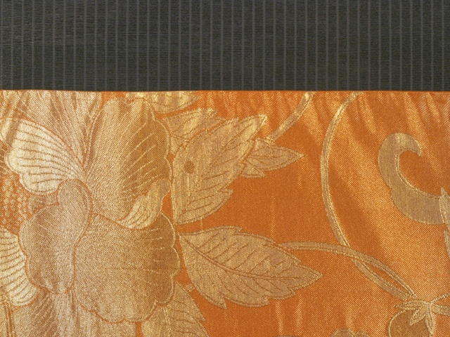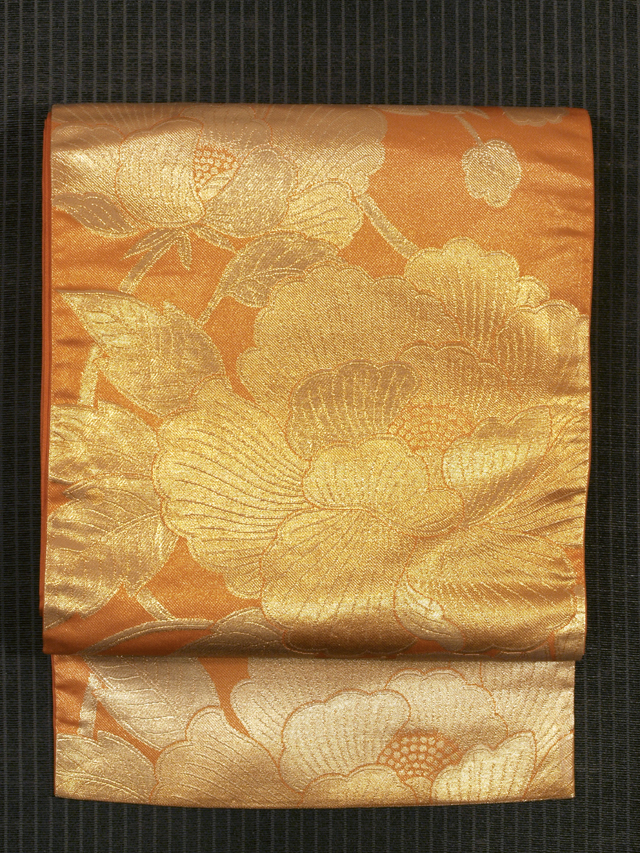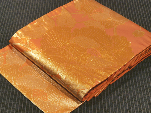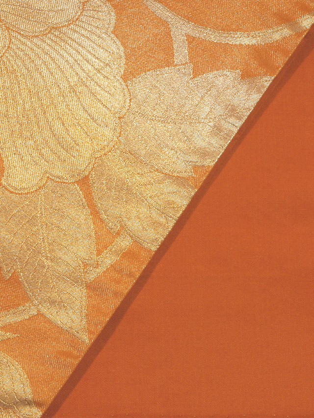 全体的な印象としては金色がかった沈んだ蜜柑(みかん)色といった地に牡丹唐草の文様が織り込まれている西陣織の袋帯です。 アンティークに近いお品です。のびやかな牡丹唐草がオリエンタルな趣きを醸し、葉の穴まで表現されていて、小粋な雰囲気が感じられます。帯芯が入れられていないので、軽めの帯がお好みの方におすすめです。 ユーズド品と思われますが、使用感はあまり感じられません。保管上のものと思われる箔糸のこまかな織の凹みがちらほらとありますが、気になるようなものではありません。そのほかに目につくしみやよごれなどのダメージはなく、きれいな状態です。 |