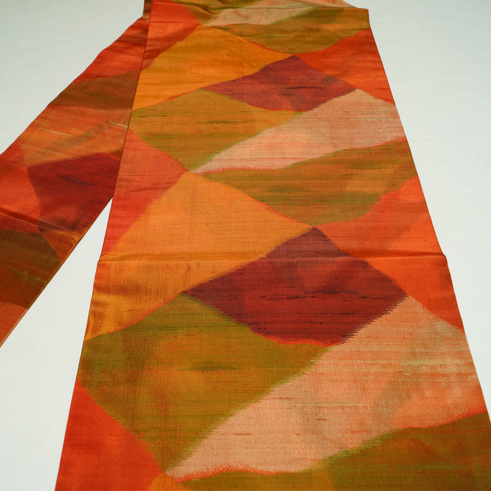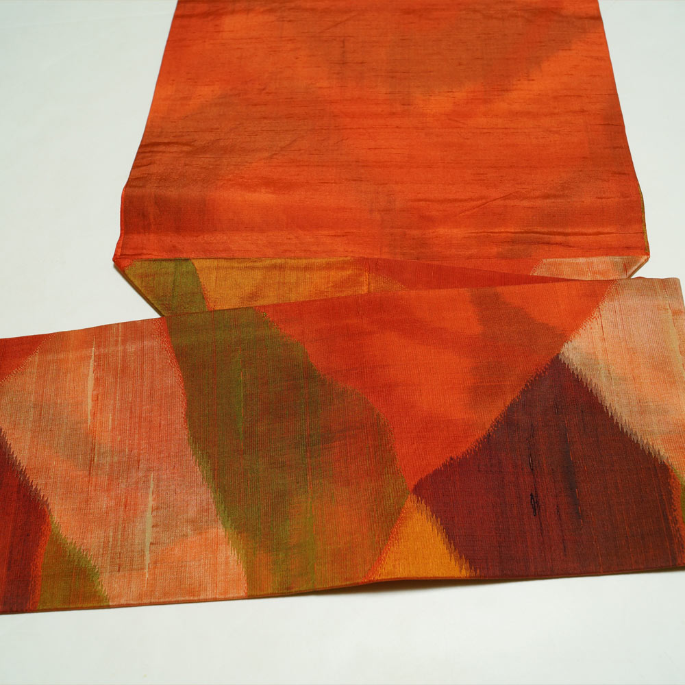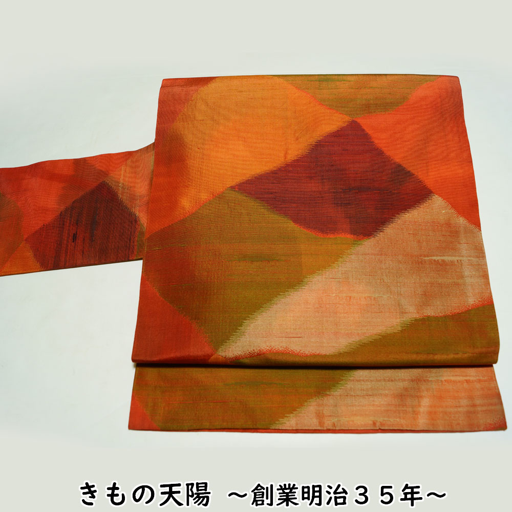 | 商品 説明 | 赤丹色系の紬地に裂取にぼかし模様が織られた名古屋帯です。 |
