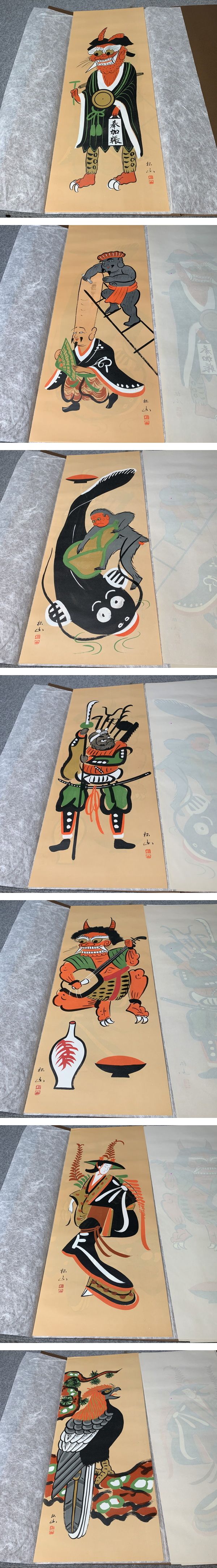 【模写】 大津絵 7点セット [B33679] 縦67cm 横25.5cm 松山 複製画 額付き 日本画 古美術 收藏