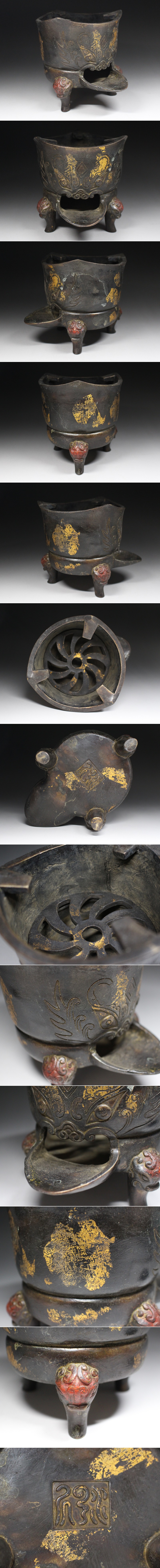 | ■古銅■鍍金・三足涼炉・獣口・獣足・風炉・瓶掛・鉄瓶・在印在銘・煎茶道具・f5115h | ||||||||||||||||||||