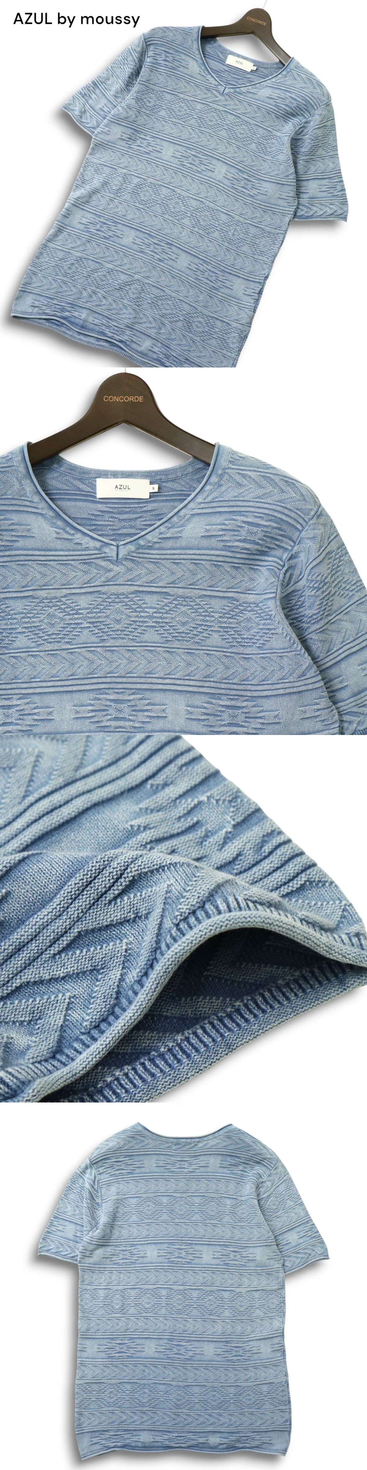 AZUL by moussy アズール マウジー 春夏 半袖 チマヨ柄 インディゴ ウォッシュ加工★ コットン ニット Tシャツ Sz.S メンズ 收藏