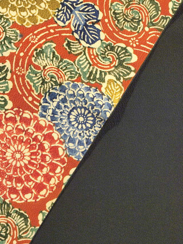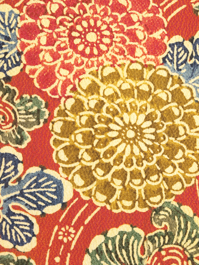 深く沈んだ紅緋色の地に、更紗調の菊唐草の文様が型絵染めされている、縮緬の付け帯です。お太鼓はご自身でおつくりいただくタイプです。 エキゾチックな趣のある意匠が華やかなお色目であらわされています。大きめのシボの縮緬地です。 ユーズド品で、胴回り部分の結び紐にうすよごれやうっすらとした黄変がちらほらとありますが、そのほかに目につくしみやよごれ、褪色などのダメージはなく、全体的にはきれいな状態です。 |