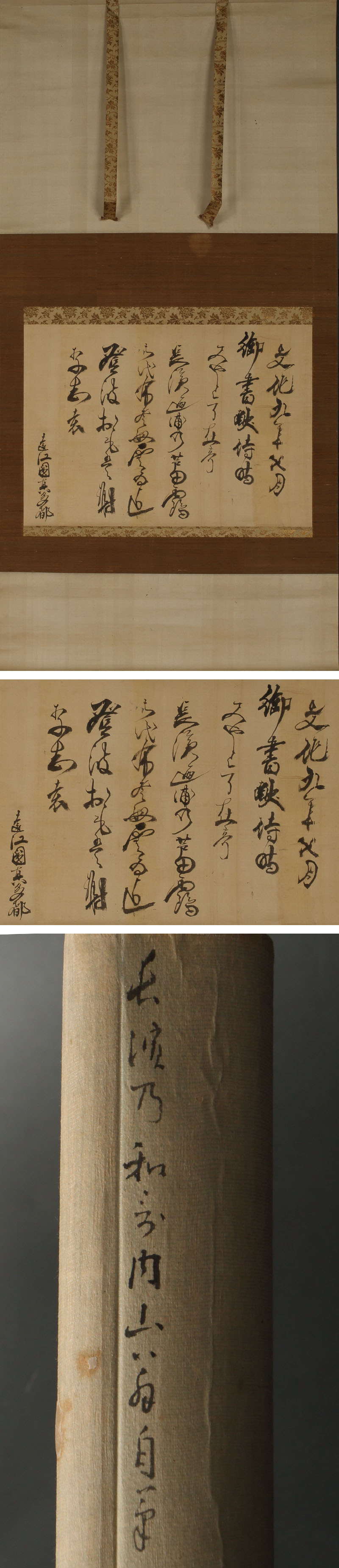 内山真龍の和歌詠草です。 「文化九(1812)年五月、御書献侍(けんじはべる)時みやこに在(ある)哥」と題し、「長浜の浦の芦田鶴千代ふとも 雲ゐ迄とはおもはざりしを」と詠んでおります。自著『日本紀類聚解』を光格天皇に献上した際に、滞在中の都で詠んだ一首であり、真龍73歳の歌です。 晩年の特異な書を伝える逸品です。 ◆内山真龍 江戸中・後期の国学者。賀茂真淵,渡辺蒙庵にまなぶ。現地をあるき「出雲風土記解」「遠江国風土記伝」などをあらわす。遠江国学の基礎をきずいた。文政4(1821)年没、82歳。遠江出身。名ははじめ敬美,竜麿。通称は弥兵衛。号は竜洞,奉国史翁など。著作はほかに「日本紀類聚解」など。 〔本文〕 文化九(1812)年五月 御書献侍時 みやこに在哥 長浜廼浦の芦田鶴 ち代ふとも雲ゐ迄 とはおもはさ りしを 遠江国真多都 寸法:高さ120cm、幅58cm(最大幅。若干の誤差はご了承下さい) 状態:経年のイタミ・シミがございます。 |