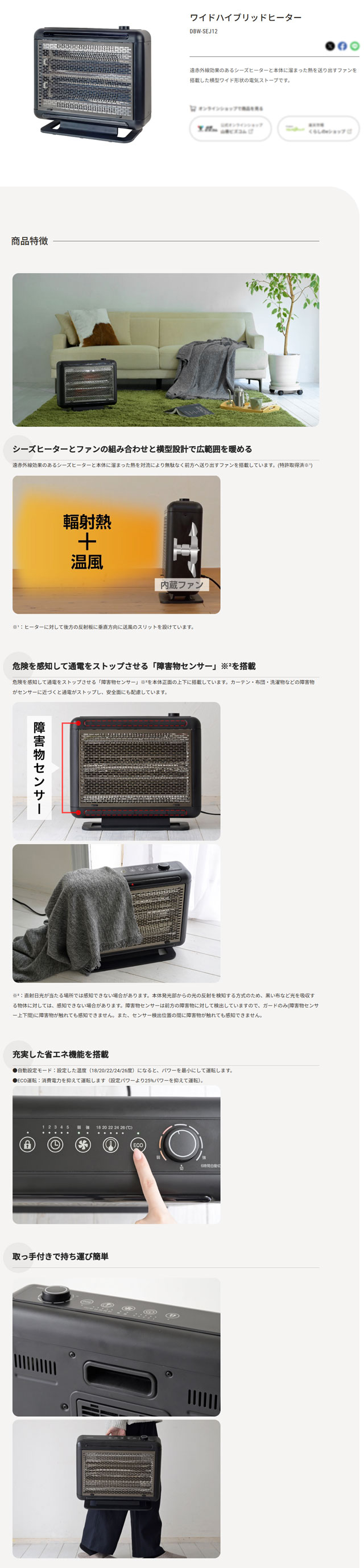 山善 ワイドハイブリッドヒーター DBW-SEJ12(AB) を出品いたします。 ■特徴■ シーズヒーターとファンの組み合わせと 横型設計で広範囲を暖める 遠赤外線効果のあるシーズヒーターと 本体に溜まった熱を対流により 無駄なく前方へ送り出すファンを搭載しています。 (特許取得済) 危険を感知して通電をストップさせる 「障害物センサー」を搭載 危険を感知して通電をストップさせる 「障害物センサー」2を本体正面の上下に搭載しています。 カーテン・布団・洗濯物などの障害物がセンサーに近づくと 通電がストップし、安全面にも配慮しています。 自動設定モード 設定した温度(18/20/22/24/26度)になると、 パワーを最小にして運転します。 ECO運転 消費電力を抑えて運転します (設定パワーより25%パワーを抑えて運転)。 ■仕様■