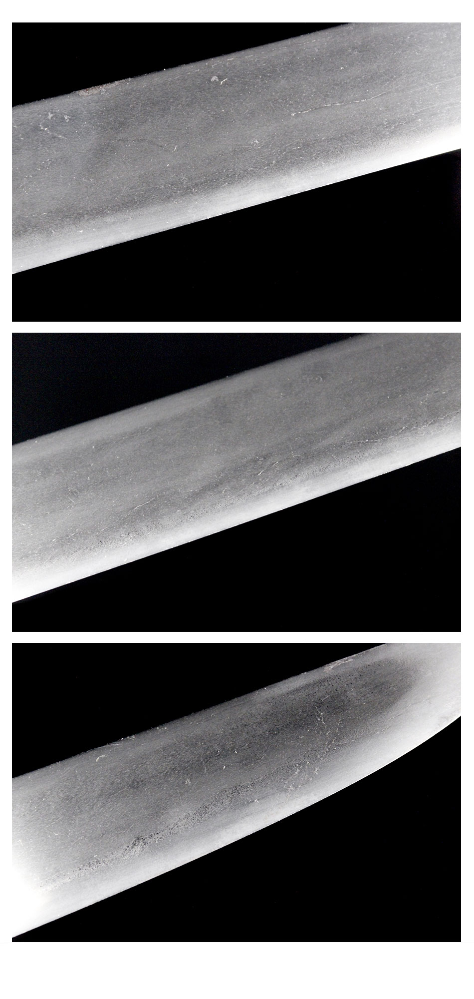 刀身長:8寸1分(約24.4cm) 反り:なし 目くぎ穴:1個 元幅:約25.6mm 元重:約7.7mm 先幅:約20.3mm 先重:約6.2mm 刀身重:約209g 棟:庵棟 ハバキ:銅 |