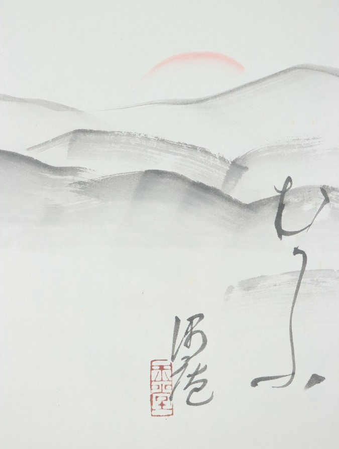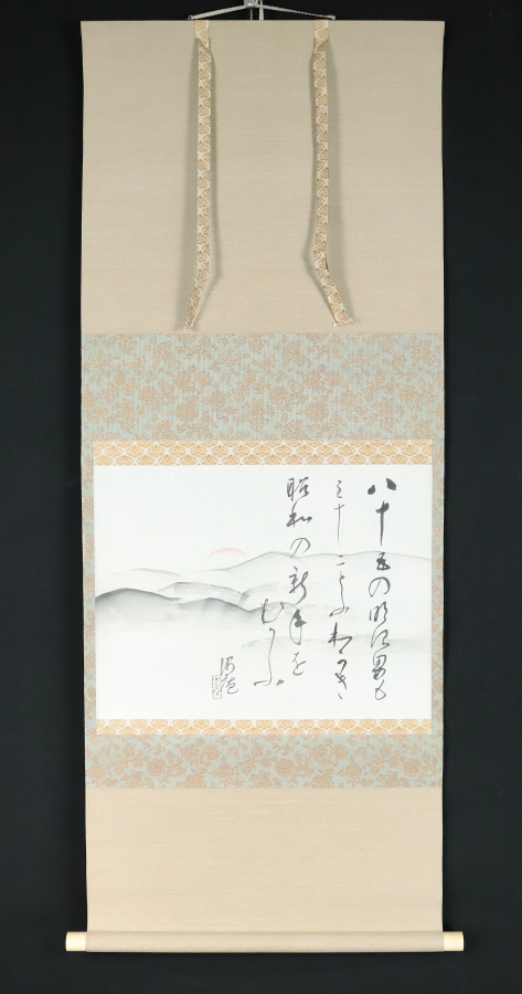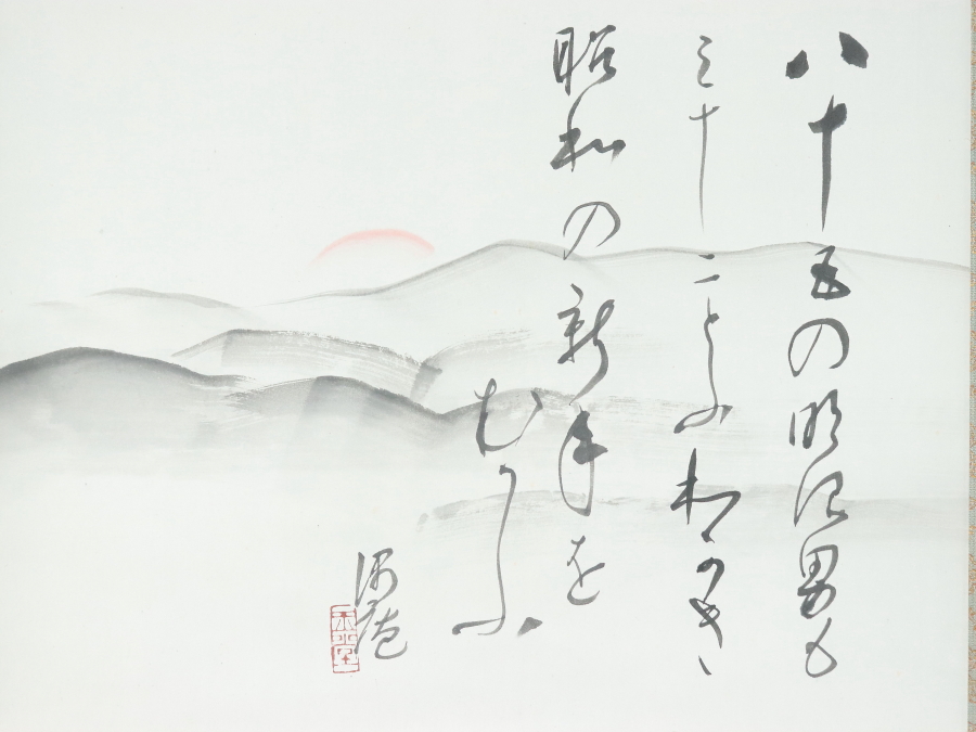 12919■【真作】川合玉堂 朝陽画賛 肉筆 川合修二極箱 鑑定登録有 幸野楳嶺師事 愛知の人 掛軸 收藏
