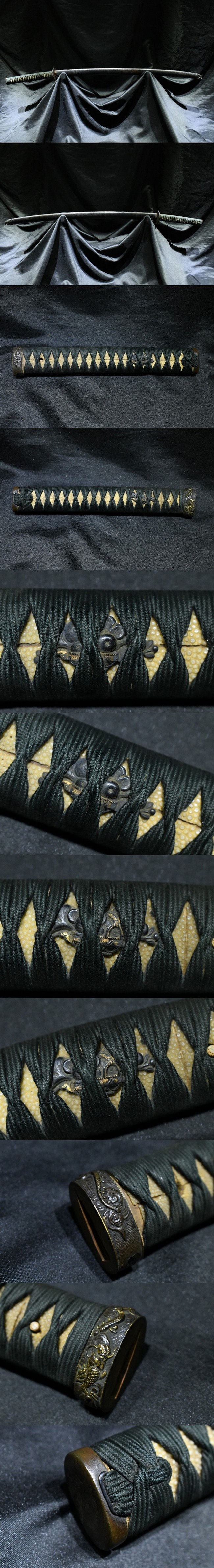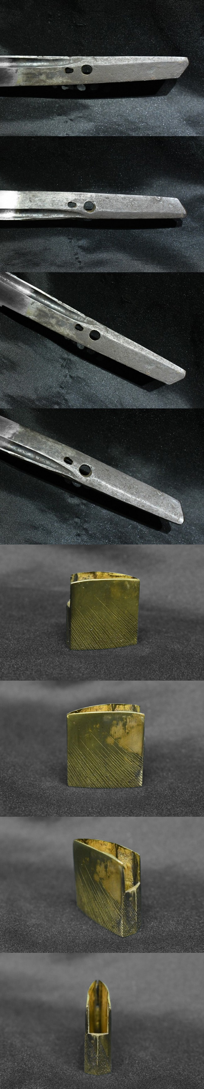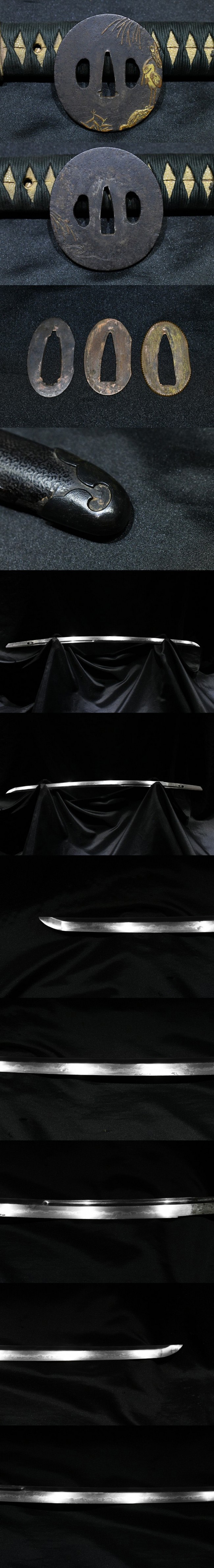 表【-】 裏【-】 種別: 脇差 サイズ:長さ 56.4cm 反り: 1.2cm 目くぎ穴 2個 元幅:約 2.643cm 元重:約 0.736cm 先幅:約 1.889cm 先重:約 0.585cm 刀身重量:約 530.0g(ハバキ・柄をとった状態) ハバキ重量:約 17.5g 柄重:約 118.4cm 柄横:約 23.6cm 鍔重:約 107.1cm 鍔縦:約 7.201cm 鍔横:約 6.615cm 鍔厚さ:約 0.418cm 拵全長:97.1cm |