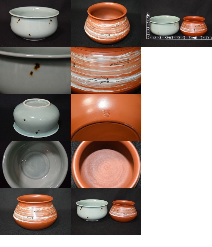 【光成】常滑焼「飛青磁・平型建水」「目高彫文・朱泥建水」未使用・在銘⑥