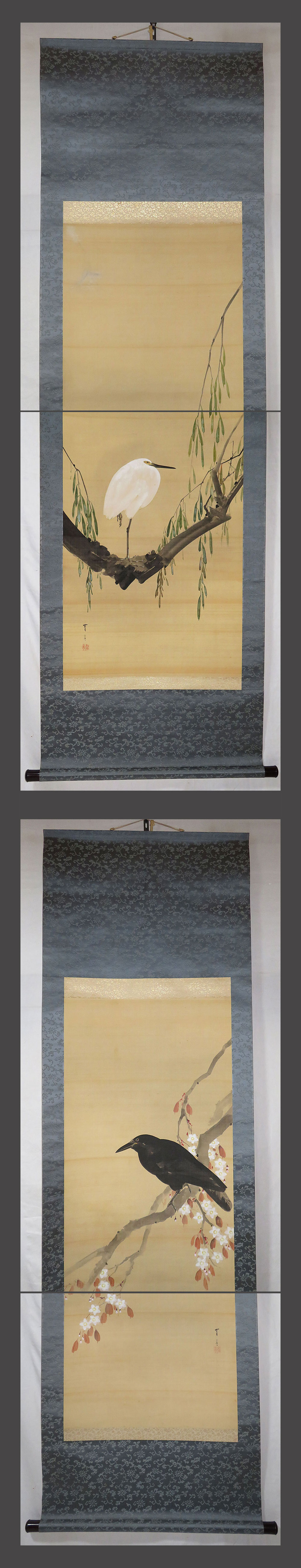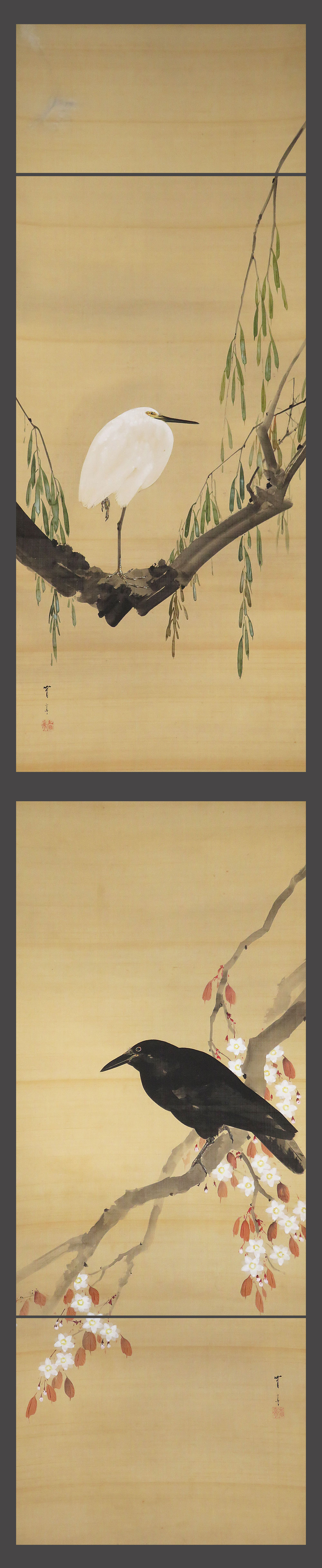【adva】【真作】■渡辺省亭■柳鷺/櫻鴉図双幅■箱書有■洒脱な花鳥画を得意とした画家■肉筆■掛軸■掛け軸■日本画■ 收藏