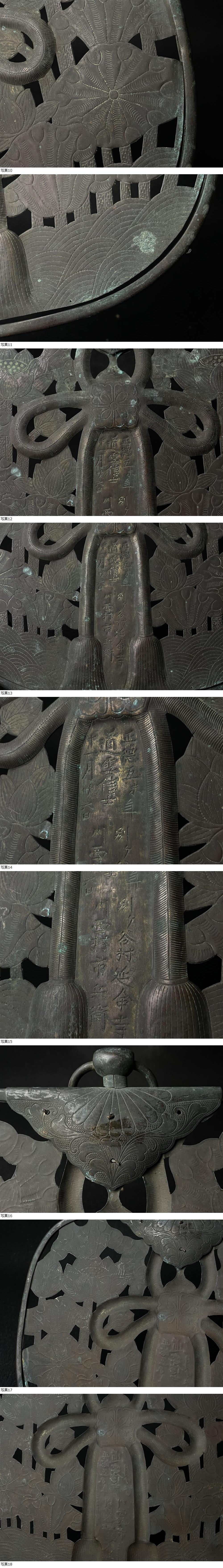 | 仏教美術 華鬘 正徳五未年(江戸期) 別ヶ谷村 延命寺 新潟県 鍍金 金銅華鬘(けまん) 川西村市兵衛 道雲信士 江戸中期 1715年 |