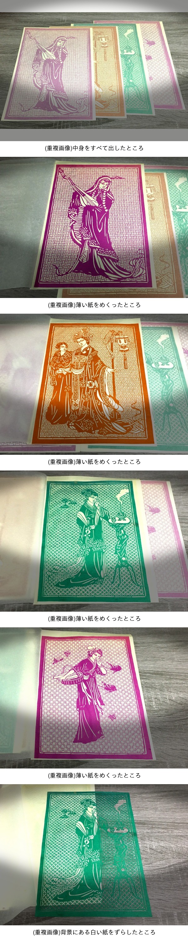 | ------------------------------------------------------------------------ ж ж ж 商品について ж ж ж ------------------------------------------------------------------------ ◆ 「 剪紙 四大美女 」 全4枚。 各 A4サイズ程度です。 何十年も前に 中国にて入手したものです。 紙パッケージは 二つ折りにして保管していたことがあり、中央にくっきり折り目がついています。 切絵本体をクリアファイルに入れて保管していたことがあり、覆っている薄い紙の上部を 折ってしまっています。 切絵本体には折り目は入れていません。 紙パッケージ、中身とも 経年のシミ、変色、色移り、などが確認できます。 入手より かなり経年しており、記載以外にも 初期、経年 による劣化、及び 保管時、取り扱い時などのダメージ必至です。 ※ 商品は 画像1枚目のもので全てです。 ※ 自身が 当時 新品で購入した ワンオーナー品です。 ※ 画像は 実物よりきれいに写ってしまう部分があります。 また、最初の検品・出品から 時間が経っているものは、掲載画像・説明にはない 劣化 及び ダメージの増加 など 必至です。商品状態は現物優先です。 ※ ペットなし、非喫煙環境です。 |