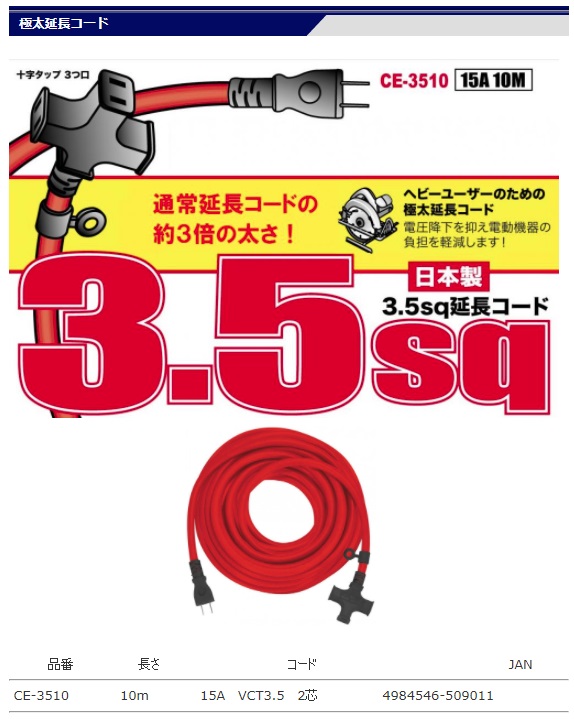 フジマック FUJIMAC延長コードシリーズ極太延長コードCE-3510ヘビーユーザーのための極太延長コード!電圧降下を抑え電動機器の負担を軽減します!コンセント不足&容量不足ダブル解消!■商品説明・サイズ:約長さ10m・電線:VCTケーブル 3.5SQ・定格:2芯 15A・コンセント数:3個口※この商品はお取り寄せの為、発送までに3~7日かかります。 メーカー欠品等でご注文をお受けできない場合が御座います。
