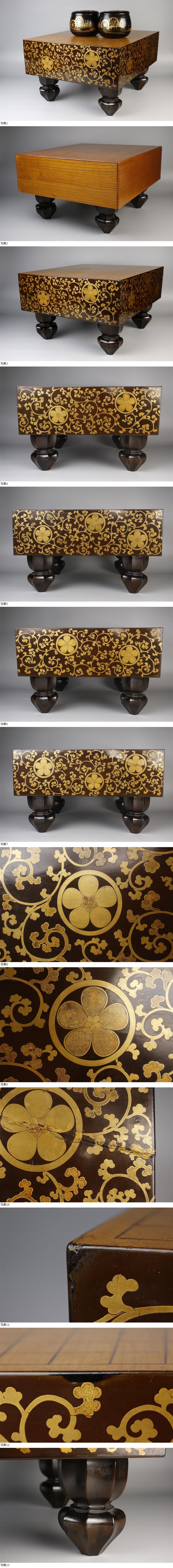 26010502* * * 商品詳細 * * * ここでしか出逢うことのできない唯一の美をご紹介させて頂きます。 絢爛豪華、鮮やかな蒔絵が施された碁盤に碁笥、碁石のセットです。 金蒔絵に梨地という豪華な仕上がりで、その場の空気明るく華やかにする優雅な佇まいが見事です。 碁笥にも蒔絵が施されており、黒地に美しく映えます。 碁石は雪印、柔らかな色味にも温かみが感じられます。 どれをとっても素晴らしい出来栄え、高級感溢れる逸品です。 この機会に是非お手元にてご堪能下さい。 ■商品内容/碁盤、碁笥 一対、碁石 白181個、黒180個、各箱 ※写真にあるものが全てです。 ■サイズ/碁盤:横40.5cm×縦26.5cm×奥行44.5㎝ 厚み14㎝ 碁笥:横12.5cm×縦10cm 碁石厚み:8.2~9.5㎜ 箱:横45cm×高30.5cm×奥行48.5㎝ 横29.5cm×高15cm×奥行15㎝ ■状態/碁盤にスレ、キズ、漆にヒビ、欠け、割れ、シミ、へこみ、直し、 碁石にスレ、キズ、汚れ、碁笥に浮き、剥げ、欠け、漆にヒビがございます。 箱にスレ、キズ、碁盤の箱に欠け、割れ、剥げ、碁笥の箱の紐に破れがあり脆くなっています。 ※写真にてご確認、ご了承の上ご入札下さい。 * * * 支払詳細 * * * !かんたん決済 * * * 発送詳細 * * * 入金確認後3営業日以内に発送致します。 ※直接引き取りも可能です。 60~160サイズにつきましては 佐川急便、ゆうパックのどちらかで発送いたします。 ゆうパック発送の場合、弊社の発送日から追跡サービスに問合せ番号が反映されるまで 約1日ほどお時間がかかりますのでご了承下さい。 * * * 注意事項 * * * 運送中の破損があった場合は速やかに当社までご連絡下さい。 保険を利用するのに受取連絡後に運送会社による現場での破損状況確認が必要となります。 勝手に返送されますと保険の適用外となりますのでご注意ください。 * * * * * * お問い合わせ:082-236-8669 |