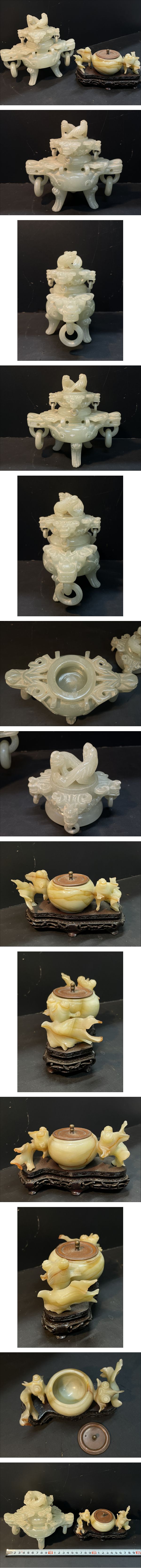 2-M211/4-60 中国 香炉 2点セット 龍? 金魚 彫刻 翡翠? 蝋石? 石 石細工 お香 線香 焼香 仏具 美術品 置物 インテリア 古玩 アンティーク | |||