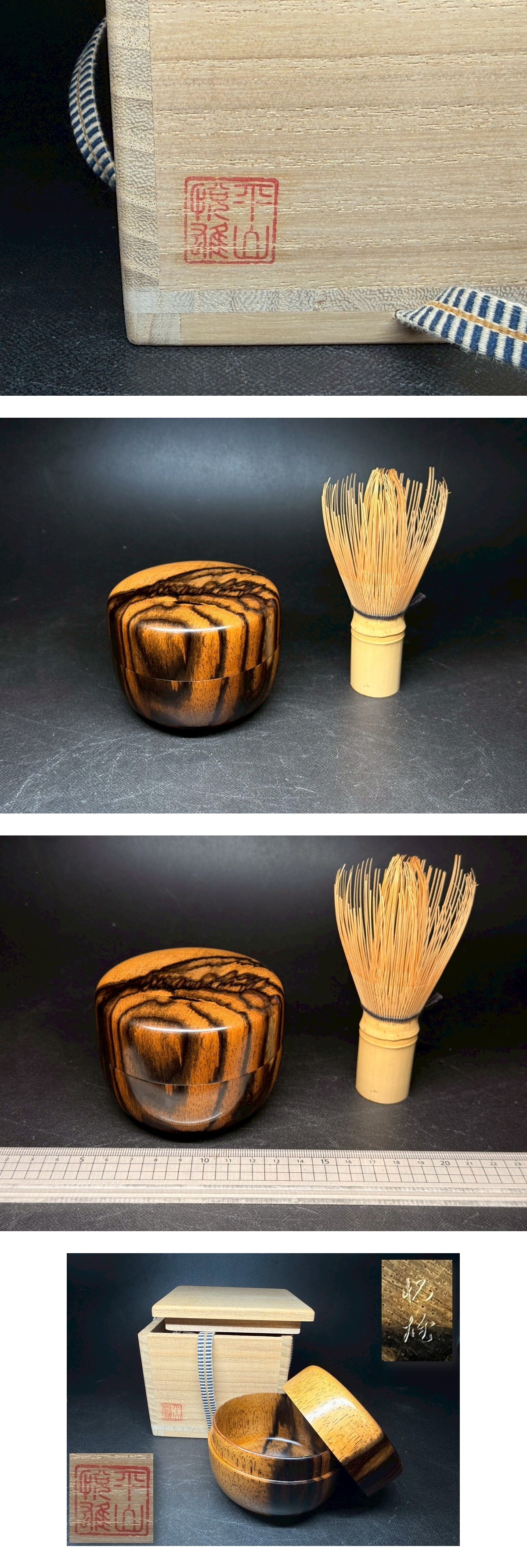 ●希少 銘木【黒柿】平山悦雄 作 銘 平棗 共箱 栞 茶道具 時代物 極上の孔雀杢 網杢 骨董 日本伝統工芸品 旧蔵出 初心出 コレクター放出品33 ■サイズ:直径 8.8cm/高さ 6.4cm ※素人寸法の為、若干の誤差はご了承ください。 ■状態につきましては経年に伴うスレ・汚れ・小キズ などが見られます。 ※その他の細かな状態は写真にてご確認・ご了承の上 ご入札くださいませ。 ●こちらの商品などは時代物や古いお品・骨董品となり ますので、細かな状態を気にされる方・神経質な方の ご入札はご遠慮くださいませ。【EHN/Y】 |