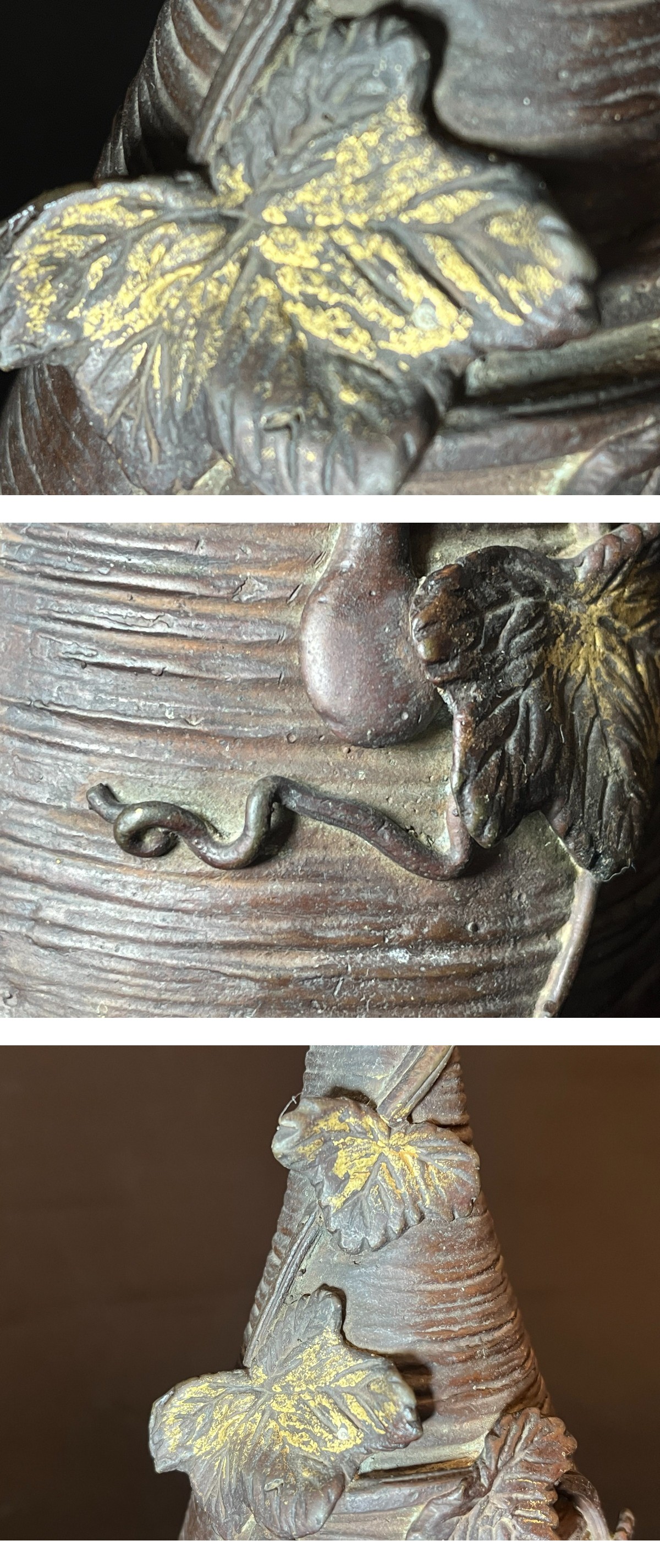 | 商品説明 | 金細工 蝸牛 葵弦金張 明治金工 銅製花瓶 時代物、初蔵出。 寸法:高27.2cm 巾最大7.5cm 重量534g 収集家所有物。画像の物が全てです。 時代物にて埃や銅錆などはご了承願います。 お探しの方いましたらご覧ください。 |