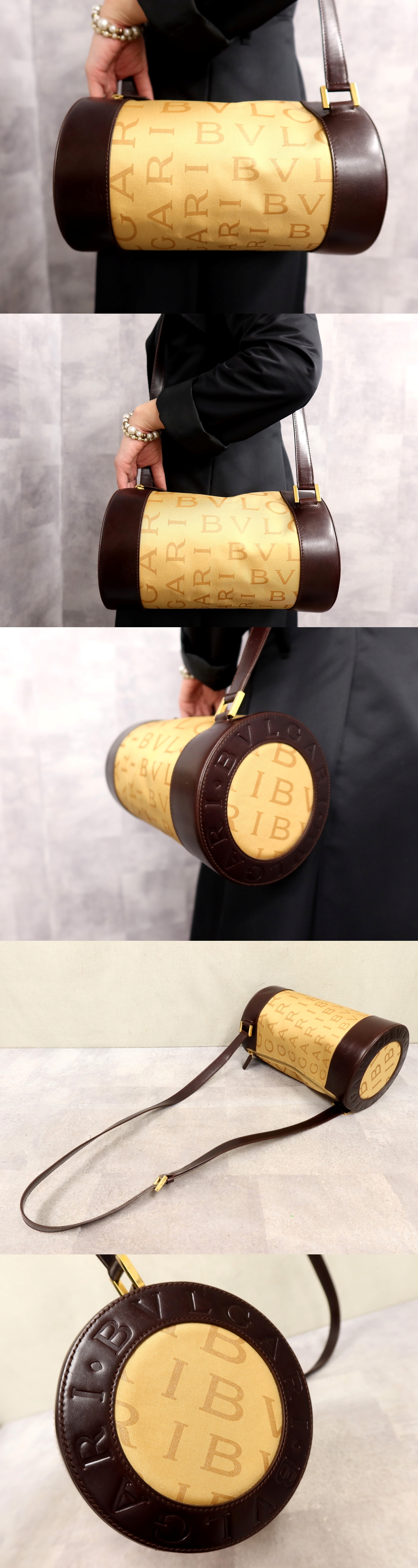 ●超美品●BVLGARI ブルガリ●ロゴマニア●ナイロン カーフ レザー 本革●ドラム型 ショルダー バッグ●ブラウン ベージュ●G金具●Js65617 收藏