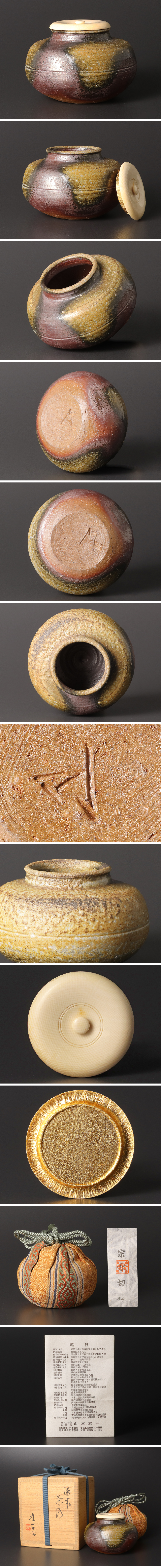 【山本雄一】 人間国宝指定備前作家の山本陶秀の長男に生まれ、少年期より父から製陶を学ぶ。1962年に日本伝統工芸展に初入選、以降入選を重ね68年には正会員に就任、また同展のほかにも岡山県美術展や玄画展、備芸展、その他の展覧会に積極的に参加。66年に岡山県美術展県展賞、76年備芸展知事賞、同年日本工芸会中国支部展支部長賞、77年日本工芸会中国支部展金重陶陽賞、80年第一回岡山日日新聞芸術文化賞、81年岡山県文化奨励賞、同年玄画会展文部大臣奨励賞、83年岡山県展大賞・同展山陽新聞社大賞、92年山陽新聞賞文化功労賞、96年茶の湯の造形展田部美術館賞、同年玄画会展内閣総理大臣賞、同年岡山県指定重要無形文化財に認定、同年岡山日日新聞芸術文化功労賞、98年に紺綬褒章を受章。父のロクロ技術をよく受け継いで造形に秀でるが、独自の技術として、1968年に備前焼では初となるガス窯を完成させて焼成。特に火襷の窯変をよく研究し、藁の繊維を用いて、焼成前に絵付けを施して創造性のある窯変発色に成功。個性に乏しいといわれる備前焼作品に、明確に自分を作品に主張しており、展覧会はもとより国内外の個展で高い評価を得ている。 |