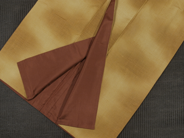 淡い狐(きつね)色の地に、濃淡のぼかしの文様が染められている、十日町紬です。袷仕立てです。 シンプルですが、あたたかみのあるお色目で、帯が映えそうですね。ほっこりとした手ざわりの紬らしい紬地です。 ユーズド品と思われますが、使用感はあまり感じられません。衿裏地に両衿先から約 15cm の部分で接ぎが入っていますが、そのほかに目につくしみやよごれなどのダメージはなく、とてもきれいな状態です。 |