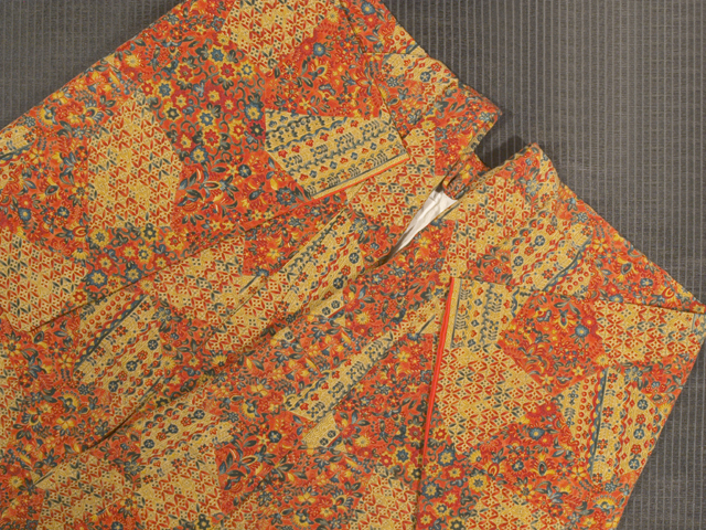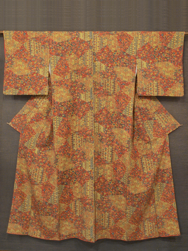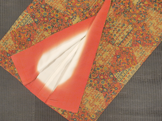 全体的な印象としては沈んだ砂色と沈んだ淡い赤橙(あかだいだい)色の地に、更紗調の唐花草などの小紋が配された切りばめ文様が染められている、縮緬の小紋です。袷仕立てです。 オリエンタルな文様が和の趣とは一風変わった印象を与えます。やや明るめながらも沈んだ落ち着きのある、小粋なかわいらしさが感じられるお色目です。シボのややこまかな、やわらかな手ざわりの縮緬地です。 ユーズド品としてはいますが、使用感は感じられません。右衽裏の八掛の白色地部分に直径約 1mm-2mm のごくうっすらとした黄変が 2 か所ありますが、ほとんど判別はつきません。そのほかに目につくしみやよごれ、褪色などのダメージはなく、きれいな状態です。 |