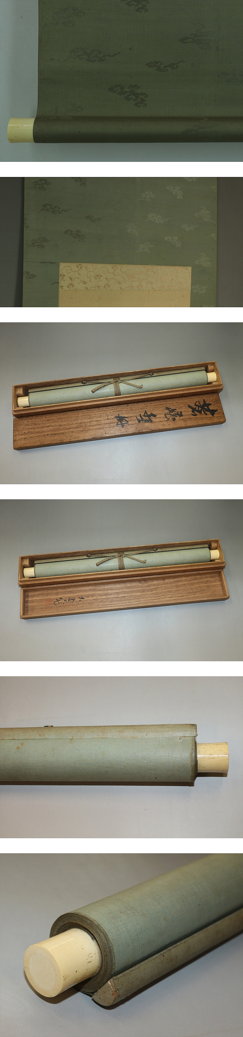 小村大雲 こむら たいうん (1883-1938) 明治-昭和時代前期の日本画家。明治16年11月9日生まれ。 都路華香(つじ-かこう)、山元春挙に師事。 大正元年文展で「釣日和」が3等賞、以後4年まで3等賞を連続受賞、 さらに5年の「画舫」、翌年の「神風」は特選となった。 13年より帝展委員。昭和13年2月20日死去。56歳。島根県出身。本名は権三郎。 本紙は、染み、折れ、皺があります。 表装は、染み、汚れ、軽い折れ、皺、虫食、ほつれ、擦れ、軸先に傷みがあります。 【サイズ】 作品 横約30.5cm×縦約135cm 表装 横約44.5cm×縦約201cm |