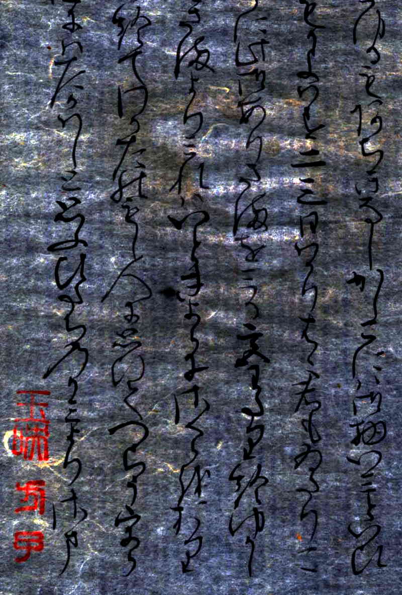 原文上部に「香煙引到楚香処」(香煙引き到る、楚香の処)香煙引到楚香処」(香煙引き到る、楚香の処)の漢詩文の落款が押捺されている。この漢詩は「白氏文集」に由来するものです。 源氏物語「東屋」原本に記されております。紫式部が「東屋」を書くに際し、「白氏文集」の漢詩を熟読したうえで「源氏物語」の「東屋の巻」を書いていることがわかります。この原詩の言葉の引用は、「東屋の巻」に用いられていることで広く知られている。紫式部がこの原詩に親しんでいたと推定されている。 |