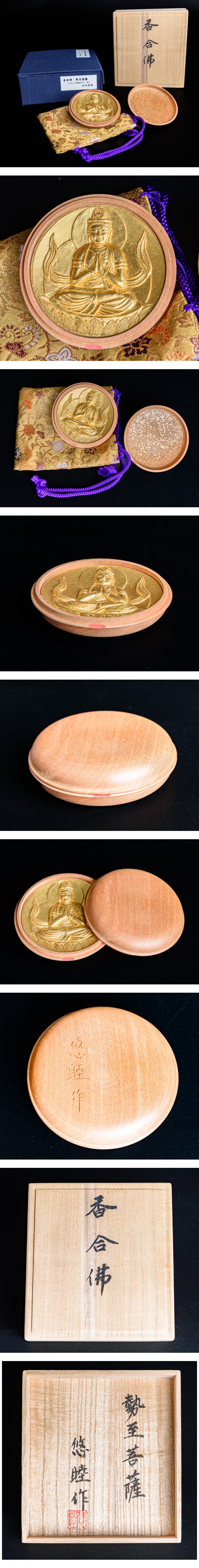 向吉悠睦 「香合佛 勢至菩薩」共箱, 仕覆 懐中仏 お守り 御守 ブロンズ金箔仕上げ 桜 L68 收藏