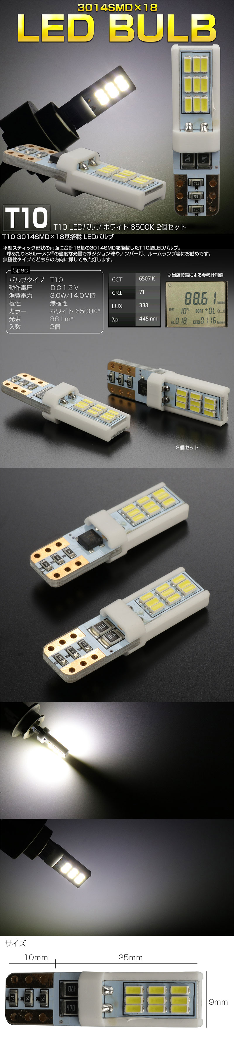 平型スティック形状の両面に合計18基の3014SMDを搭載したT10型LEDバルブ。 1球あたり88ルーメン※の適度な光量でポジション球やナンバー灯、ルームランプ等にお勧めです。 無極性タイプでどちらの方向に挿しても点灯します。 ※当店設備による参考計測値 | ■バルブタイプ:T10 ■動作電圧:DC12V ■消費電力:3.0W/14.0V時 ■カラー:ホワイト 6500K ■光束:1個あたり88lm※ ■極性:無極性 ■入数:2個セット | |