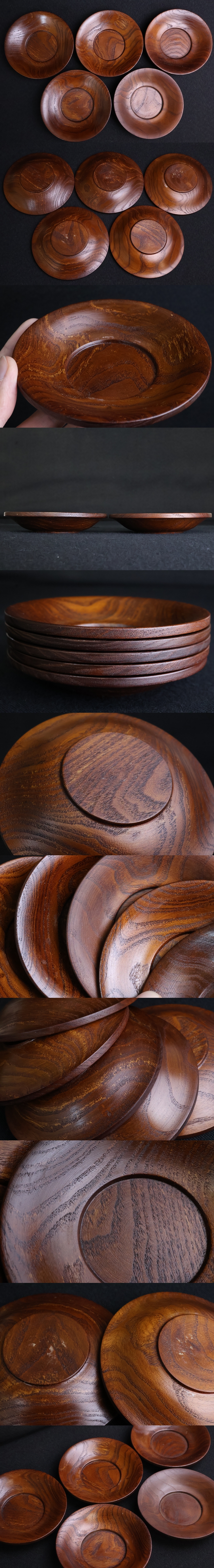 TB526円式茶托 5客 径約11cm◇木製/漆塗/拭漆/托子/刳り貫き/美杢/天然木/煎茶器/煎茶道具/木工芸/時代/骨董/古美術/古道具タグボート 收藏