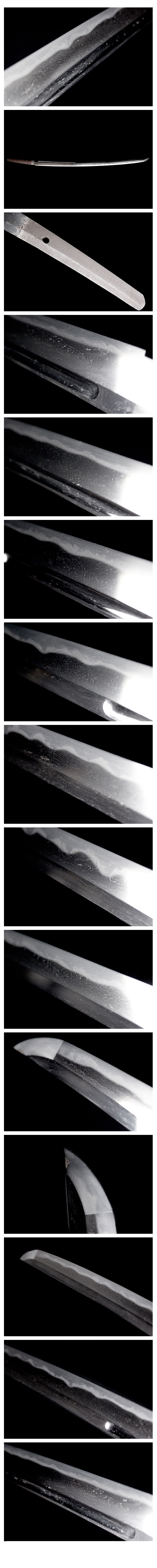 刀身長:約67cm 反り:約1.7cm 目くぎ穴:1個 元幅:約31mm 元重:約6.5mm 先幅:約20.5mm 先重:約4.3mm 刀身重:約602g 棟:庵棟 ハバキ:銅 |