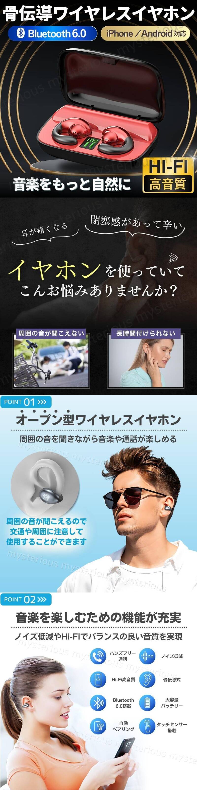 骨伝導 イヤホン ワイヤレス Bluetooth 6.0 ブルートゥース イヤフォン ノイズキャンセリング iPhone Android 充電 マイク スポーツ 防水 收藏