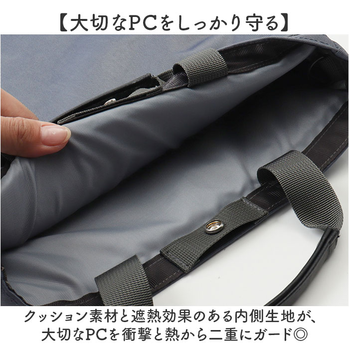 | 商品説明 | ・・【シンプル&スリムなPCバッグ】 ・持ち方を選べる2WAY&PC保護つき。毎日使いたくなる「SOLEILスリークPCバッグ」 ・ ・【2WAYで使えるスタイル】 ・内側のハンドルでトートとして、お手持ちのショルダーベルトを付ければ斜めがけにも対応♪※ショルダーベルトは付属していません。 ・ ・【13インチ対応サイズ】 ・13インチのPCがぴったり収まる、使いやすいサイズ感で毎日の持ち運びにちょうど良い。 ・ ・【大切なPCをしっかり守る】 ・クッション素材と遮熱効果のある内側生地が、大切なPCを衝撃と熱から二重にガード◎ ・ ・【スリム縦型のシンプルデザイン】 ・すっきりとした縦型シルエットは、どんなコーディネートにも合わせやすいシンプルさが魅力! ・ ・【便利な仕切り収納ポケット】 ・正面ファスナーポケット内は仕切り付きで、カードや小物の整理整頓もスムーズに叶う。 ・ ・【軽やかナイロン素材】 ・軽量ナイロン素材を採用し、毎日の通勤・通学シーンでも負担を感じさせない軽やかさ〇 |