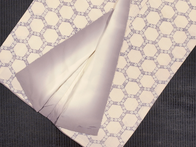 やや沈んだ薄桜色の地に、唐花草の配された藤鼠(ふじねず)色の亀甲の文様が染められている縮緬の小紋です。袷仕立てです。 はんなりとした感のあるかわいらしいお色目で小粋な雰囲気です。やわらかな手ざわりのシボのこまかな縮緬地です。 ユーズド品で、下前身ごろの衽脇に直径約 5mm のよごれが 1 か所、右後身ごろの膝裏上付近に直径約 2mm-1cm の薄めのよごれが 2 か所あるほか、全体のところどころにもごくこまかな黄変や色うつりが数か所程度あります。そのほかに目につく大きなしみやよごれ、褪色などのダメージはありませんが、状態ランク=「D」のご着用対象外、リメイク素材用とさせていただきます。 |