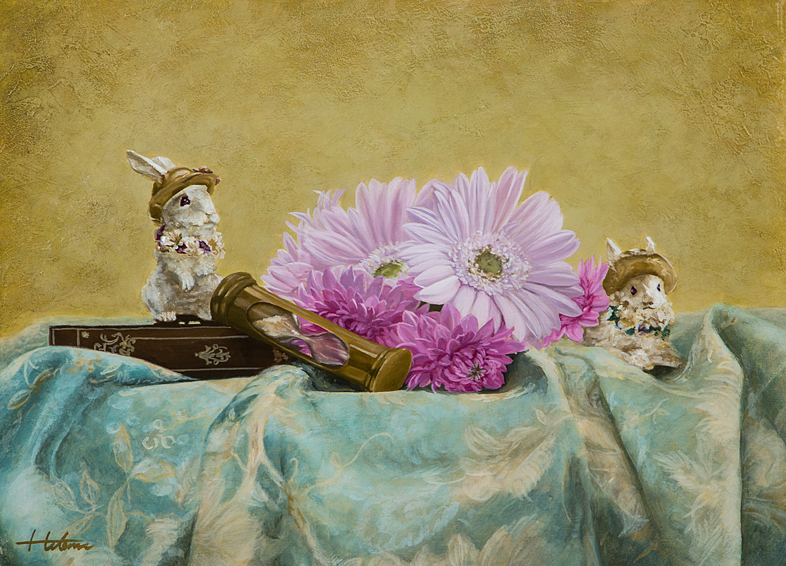 【1on1】真作 中里仁美 『ピンクのガーベラと兎のオブジェ』 油彩 キャンバス 4号 2021年 額装 / 時の流れと共に移り変わる花や風景を描く 收藏