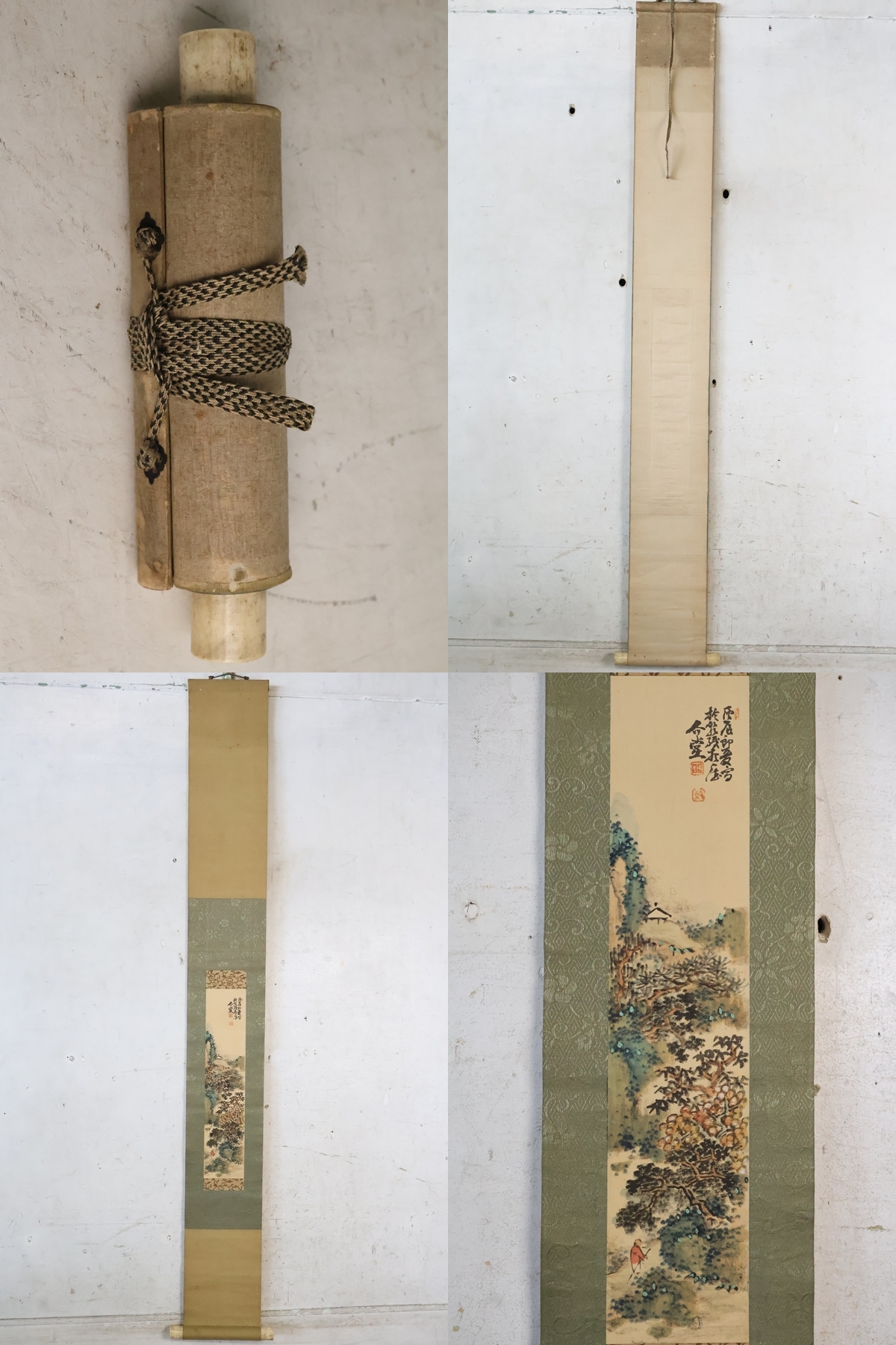 TB526短冊サイズ 山水 掛軸 絹本◇落款有/在銘/本紙/約35.5×7.5cm/色絵/日本画/掛物/床飾/工芸/時代/骨董/古美術/古道具タグボート 收藏