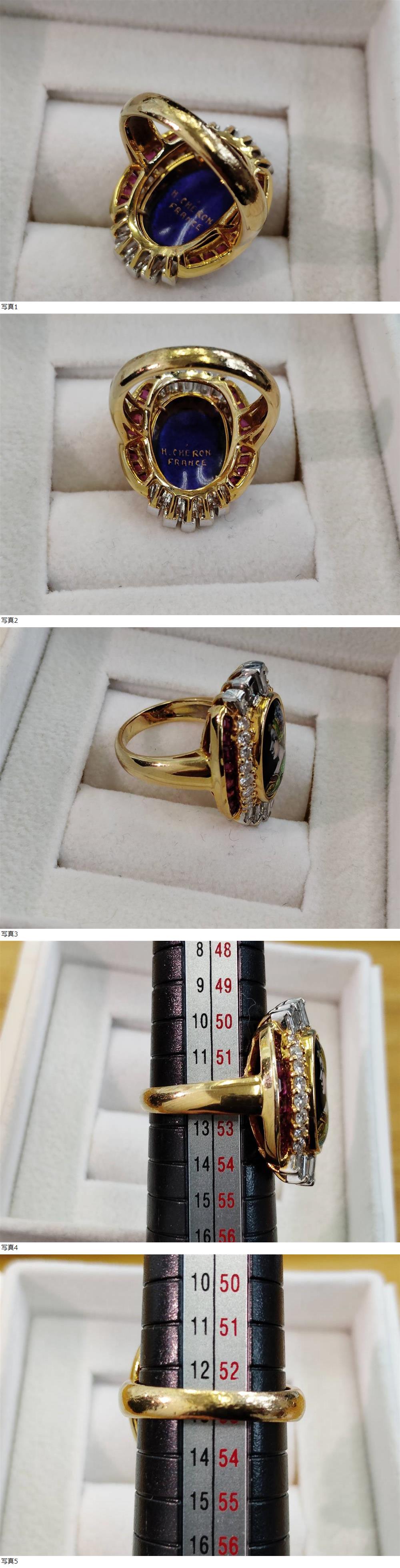 | ★梶光夫×H.CHERON 極上エマーユ&極上天然ダイヤモンド天然ルビー★超高級K18YG/Pt900リング 1.45/1.22ct刻印★ |
