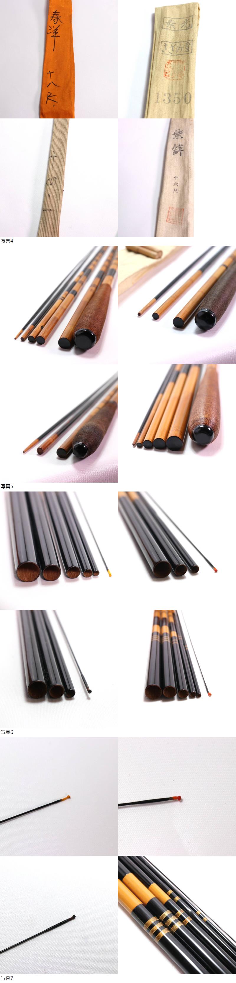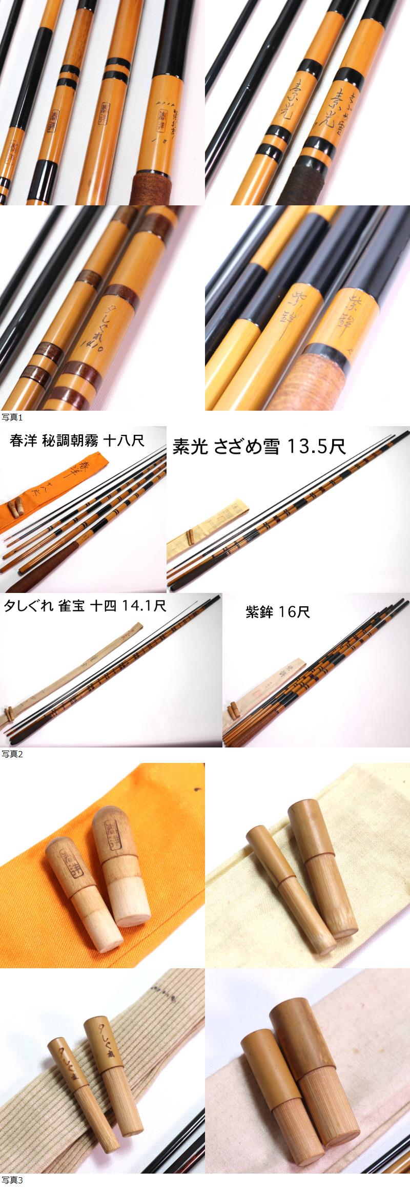 A1771 ヘラブナ竿 4本セット 春洋 秘調朝霧 十八尺/素光 さざめ雪 13.5尺/夕しぐれ 雀宝 14.1尺/紫鉾 16尺 未使用 釣具店 デッドストック 收藏
