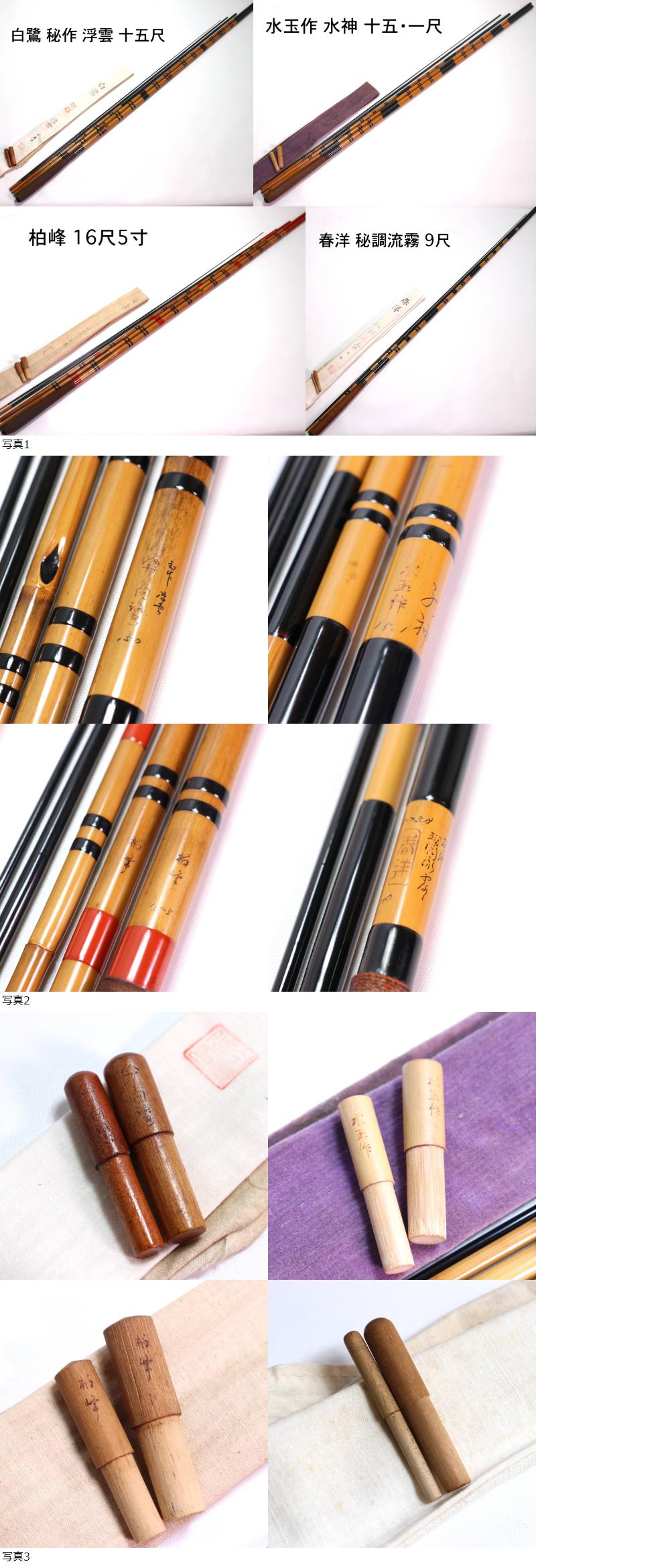 A1773 ヘラブナ竿 4本セット 白鷺 秘作 浮雲 15尺/水玉作 水神 15.1尺/柏峰 16尺5寸/春洋 秘調流霧 9尺 未使用釣具店デッドストック 收藏
