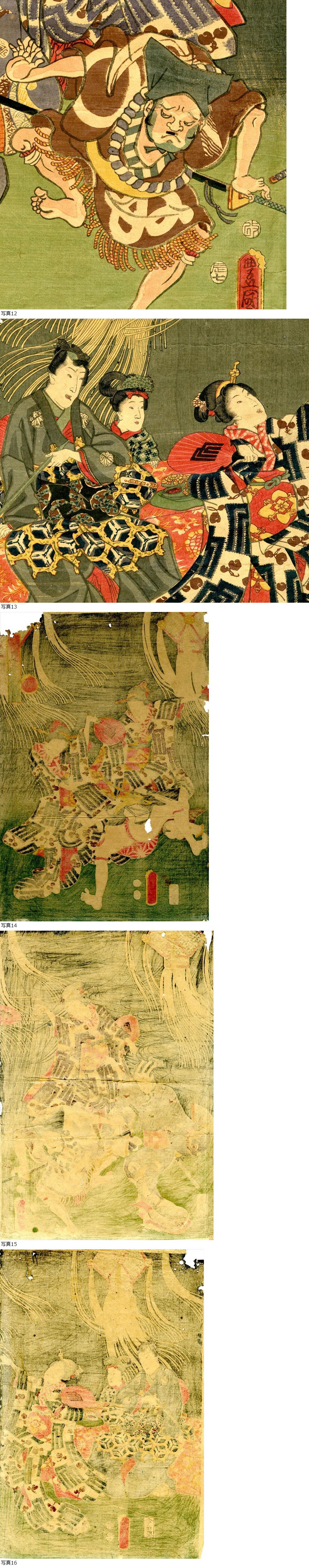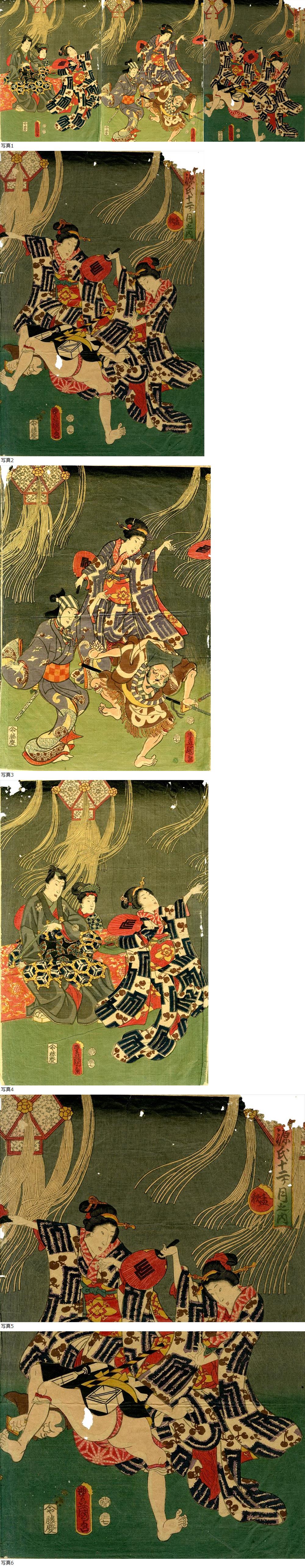 豊国 真作 「源氏十二ヶ月之内 孟秋/大判錦絵三枚」 浮世絵 江戸 木版画 盆踊り 判じ物 かまわぬ 收藏