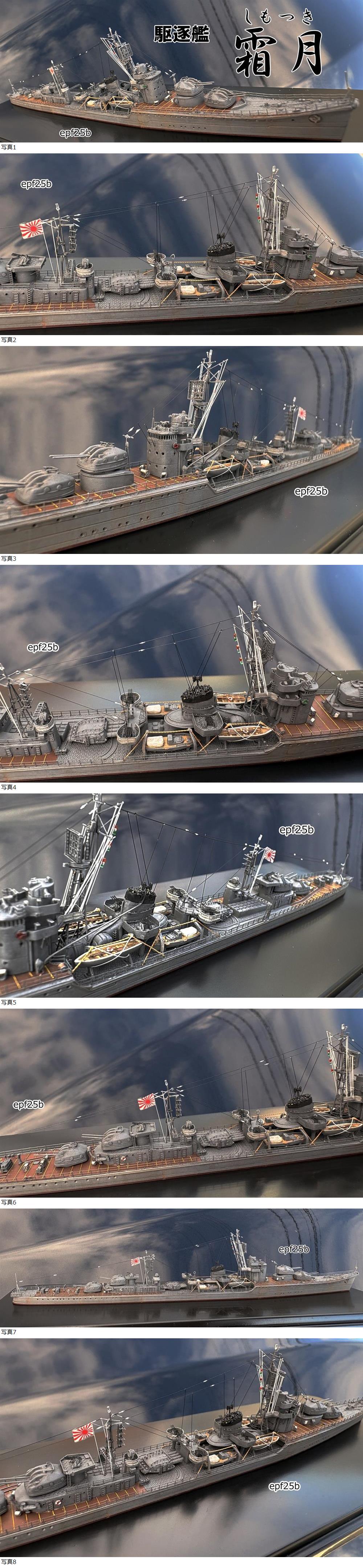 ご覧いただきありがとうございます キットはピットロード製です。 資料は写真集を参考に作製しています。 手直しした箇所は ①船体はパテで修正しています。 ②船体の窓は穴をあけなおしています。 ③リノリウム押さえ金具はランナーで再現しています。 ④リールはエッチングで再現しています。 ⑤砲身は真鍮に交換しています。 ⑥砲塔は補強材・手すり・モンキーラッタル・窓・ハッチなどをエッチングとプラ材で再現しています。 ⑦ボートダビットはエッチングとプラ材で再現しています。 ⑧煙突は排気口などを作り直しています。 ⑨蒸気捨て管は自作しています。 ⑩煙突はジャッキステイ・モンキーラッタルをエッチングで再現しています。 ⑪煙突のカバーはエッチングで再現しています ⑫炊事煙突は真鍮で作り直しています。 ⑬電探はエッチングで再現しています。 ⑭マストは真鍮で作り直しています。 ⑮艦橋は窓枠・手すり・はしご・補強材などをエッチングで再現しています。 ⑯双眼鏡は自作しています。 ⑰機銃は社外品を使用しています。 ⑱魚雷発射管は手すり・ジャッキステイ・ハッチ・モンキーラッタルなどをエッチングで再現しています。 ⑲魚雷つり上げクレーン部はエッチングで再現しています。 ⑳探照灯は社外品を使用しています。 21)爆雷装填台は社外品を使用しています。 22)爆雷投下機はエッチングで再現しています。 23)機銃座下の補強材はエッチングで再現しています。 24)旗棒は真鍮で再現しています。 他にもありますので、是非お手にとって御覧下さい。 駆逐艦 霜月 秋月型の後期型の第1艦「霜月」の建造は三菱長崎造船所で昭和17年7月6日に起工され、翌年4月7日には進水しましたが、搭載予定の缶と機関の製造が間に合わず、造船所内で係留待機をしていたところ、「秋月」が艦種を失って入渠したため、本艦の艦首を切断して「秋月」に移植し、本艦には新たな艦首を建造して取り付けました。その後、機関や缶が到着し、これらの機器や兵装を搭載して竣工したのは昭和19年3月末日でした。 |