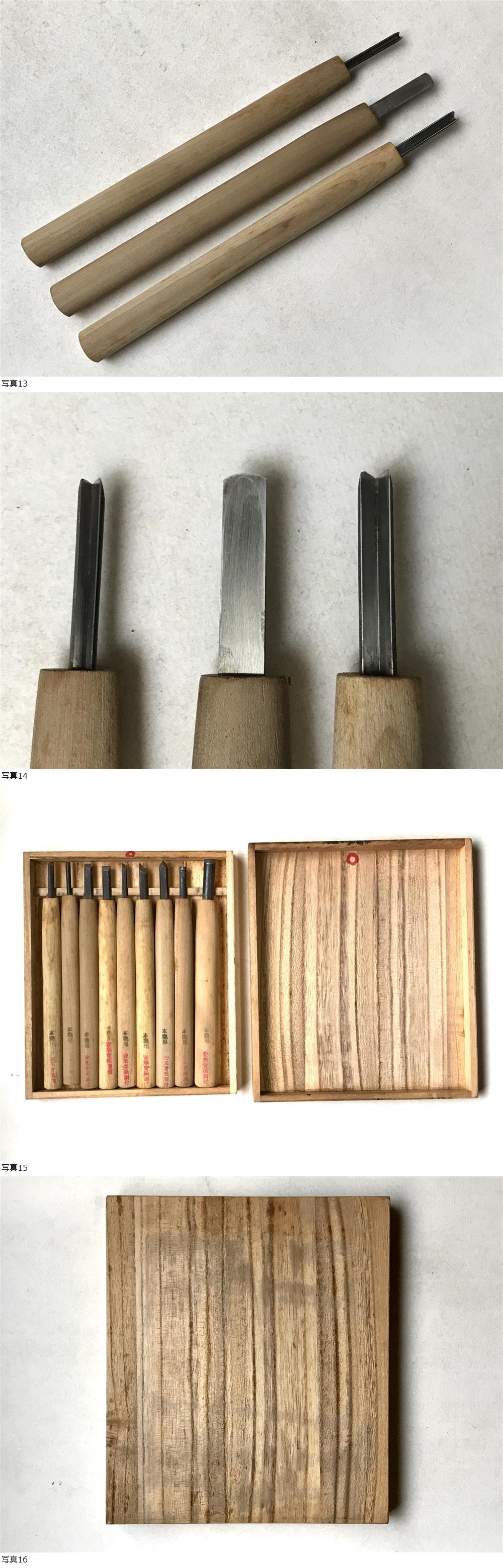 間透1m/m 、版木刀1.5m/m、安来青紙鋼付彫刻刀(丸刀、三角刀、平刀、切出し刀)