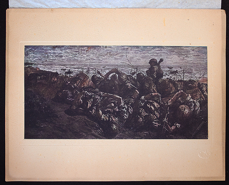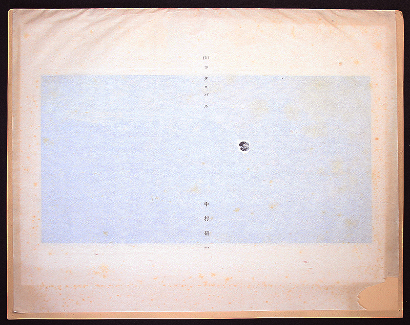| 戦前 大東亜戦争陸軍作戦記録画集 1 コタ・バル 中村研一 陸軍美術協会です。 陸軍美術協会に所属していた当時の日本を代表する画家たちが描いた戦争画の一葉です。 こちらはもちろん印刷されたものを台紙に糊付けしたものです。タトウ紙の表紙に画題と作者名が印刷されています。 台紙には番号と陸軍の星のマークが型押しされています。昭和18年以降に発売されたものだと思います。 台紙のサイズは305 X 390mmです。コンディションは経年による変色、ヨゴレ、シミ、タトウ紙のヤブレ等がございます。 |