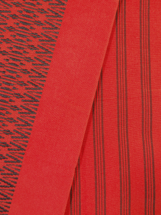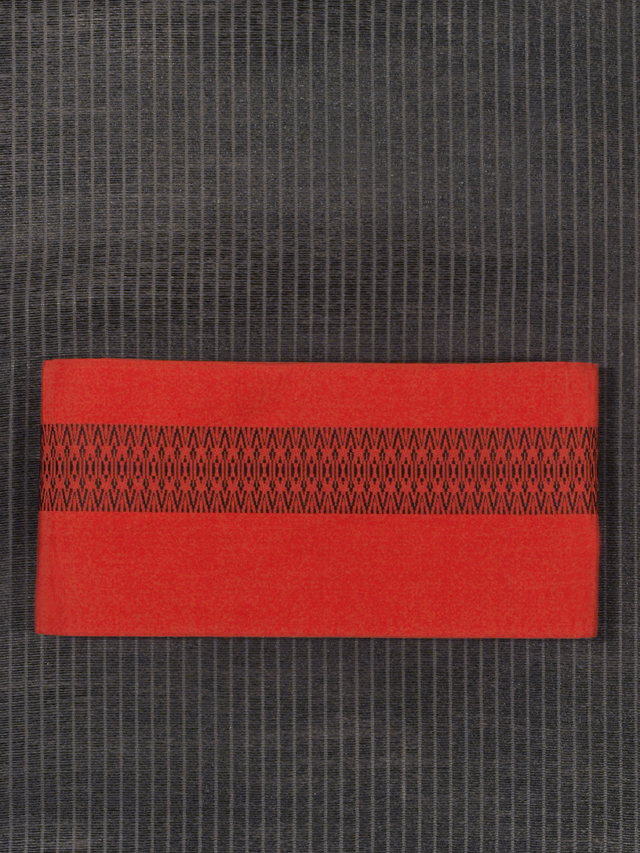 やや沈んだ緋色の地に、黒色で一本独鈷(いっぽんどっこ)の文様が織り込まれている、本場筑前博多織の半巾帯です。小袋帯です。 正式な定格献上博多柄のうちの一本独鈷だけがあらわされている小粋な意匠です。裏面には同じくな定格献上博多柄のうちの親子縞の文様が織り込まれていて、両面使えます。アンティークに近いお品です。 ユーズド品で、うっすらとした結びジワがあります。ごくこまかなくすみは若干ありますが、目につくしみやよごれ、褪色などのダメージはなく、良好な状態です。 |