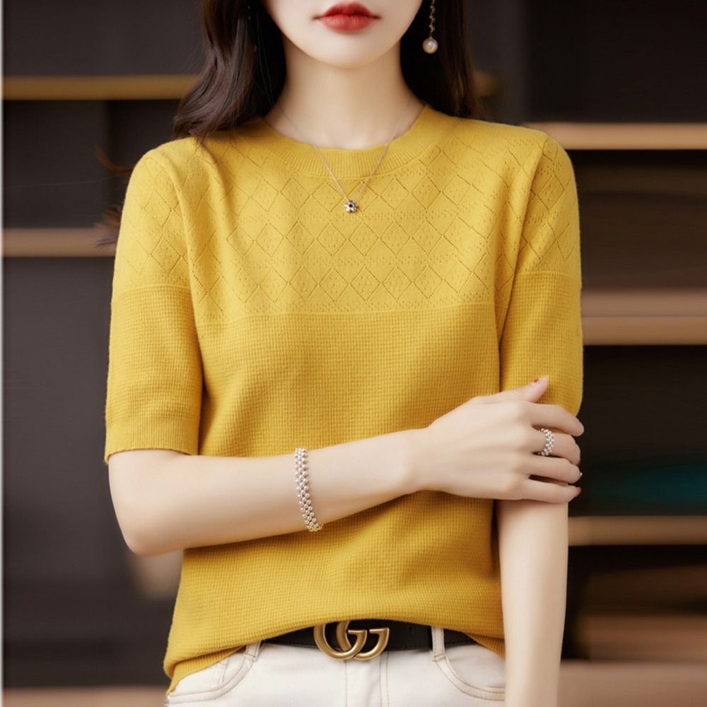 ☆ イエロー ☆ L ☆ 半袖ニット サマーニット 半袖 レディース 半袖ニット ニット トップス サマーセーター 春 秋 夏 薄手 上品 通勤 收藏