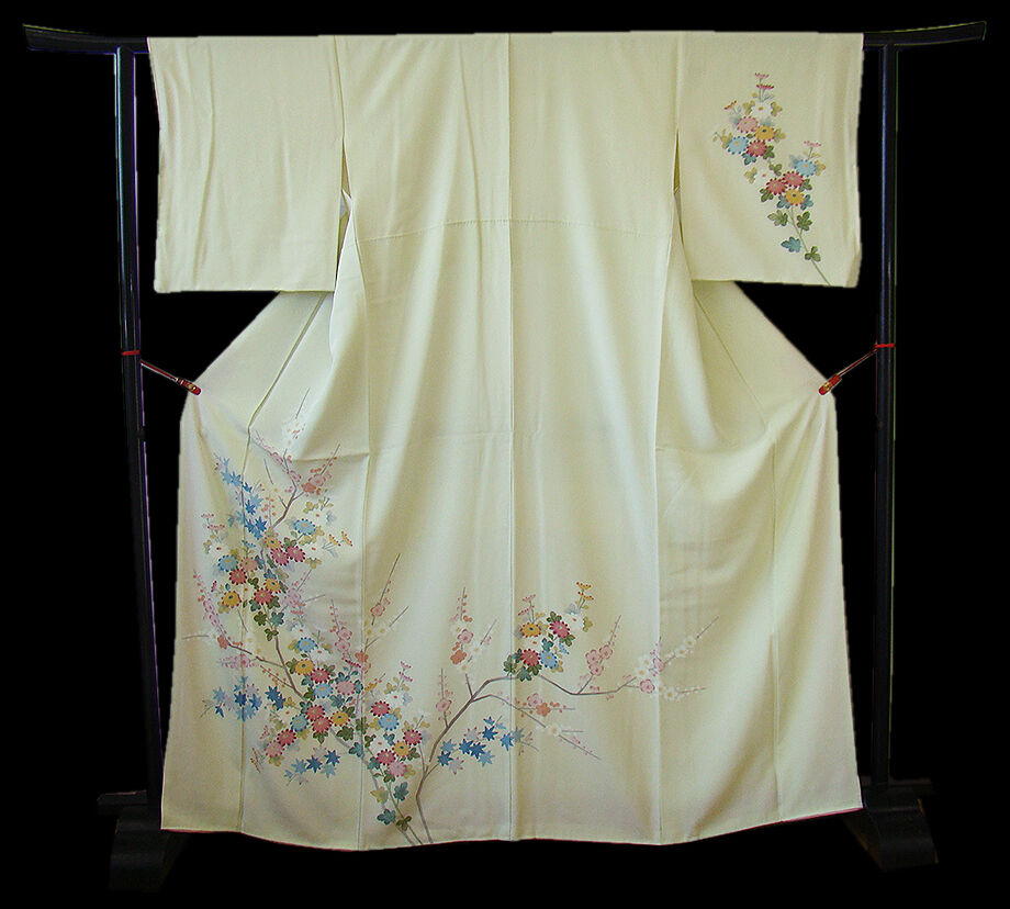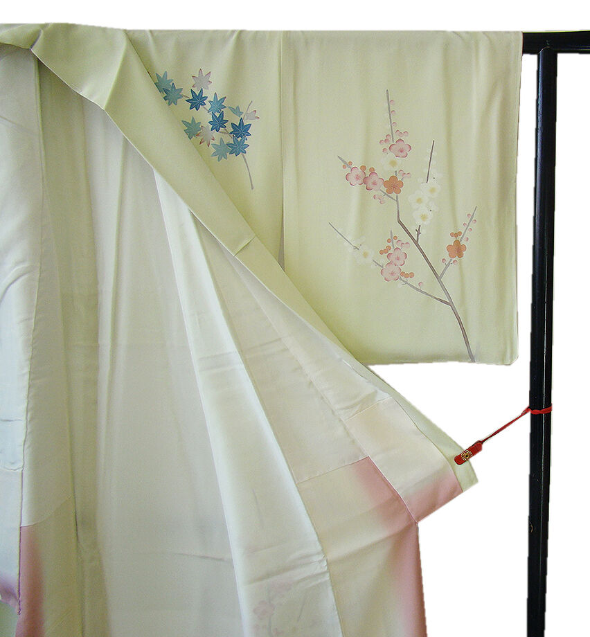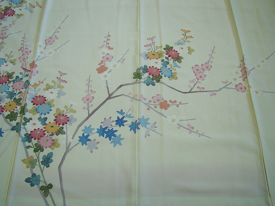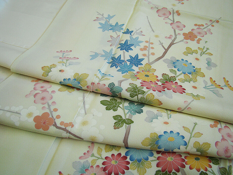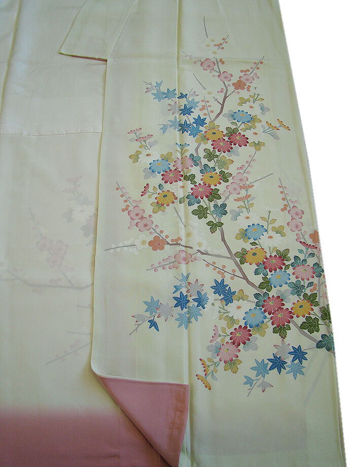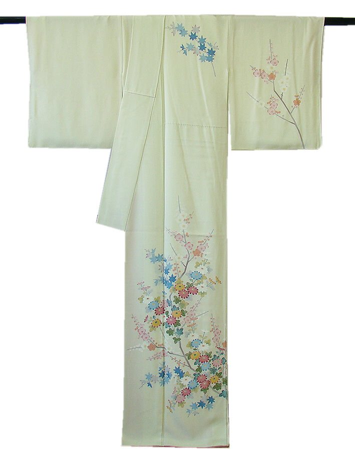 | 商品説明 | こちらのお品は「袷」ですので10月から5月までお召頂ければと思います。 とてもしなやかで柔らかな手触りの着心地良い重めの上質な極上ちりめん地の生地、 淡い白緑色地に白、山吹、紅梅、抹茶、青、水色等の花木柄の本加工染、 気品に満ち溢れた彩りが正統派のお着物として一枚は欲しい逸品の素敵なお着物です。 八掛は撫子色(正絹)、幅広い年代の方にお召頂けます。 |