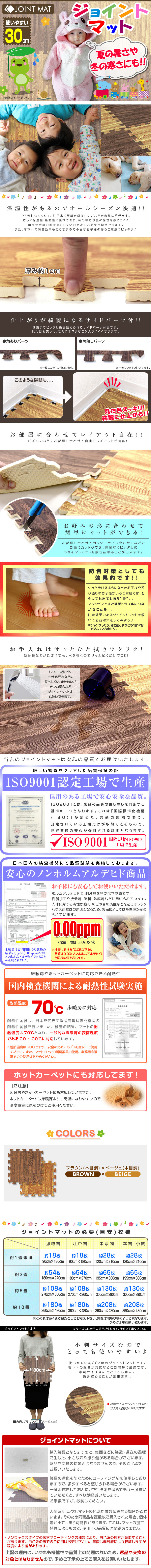 パパもママも安心! 30cm 小判 ジョイントマットです。 カッターやはさみで簡単に切れるのでレイアウト自由自在! 小判だから、狭い場所でも敷きつめやすい! 足音をやわらげてくれるので、子供部屋やフローリングのお部屋に最適です! 適度なクッション性が転倒時に衝撃を和らげてくれます! 冬は床下からの冷気をカット! 夏は冷房による温度を効率よく保ちます。 汚れた部分は取り外して水洗いが出来てカンタンお手入れ♪ 嬉しい!サイドパーツ付き! 壁ぎわに敷いても、隙間なくキレイに。 掃除がラクラク!! 自然をイメージした木目デザイン! お部屋に落ち着いた雰囲気を与えてくれます!